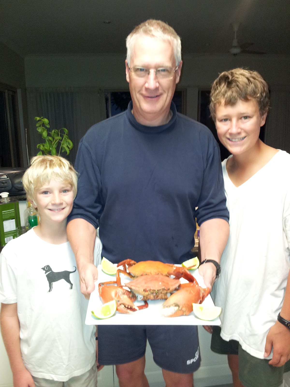 The boys have been really diligent, spending hours fishing and crabbing… They take fishing mags out of the library, talk with classmates; learning the local tides and ocean environments of Moreton Bay. All that hard work is beginning to pay off! Not only have they caught a few keepers that provided wonderful dinners…by using the fresh heads n’ guts in our crabpot, we have also landed some huge legal-sized mud crabs….The prosaic name aside, these are the sweetest, cleanest crabs I’ve ever had, easily on par with the famous Dungeness crab of the Pacific NW, and they are HUGE….Of course, now they’re begging to hire out a boat and get into open water, after the local snapper and pelagic (open ocean) species; tuna, wahoo, jack, even marlin! So we hope to soon…Stay posted..ddu…